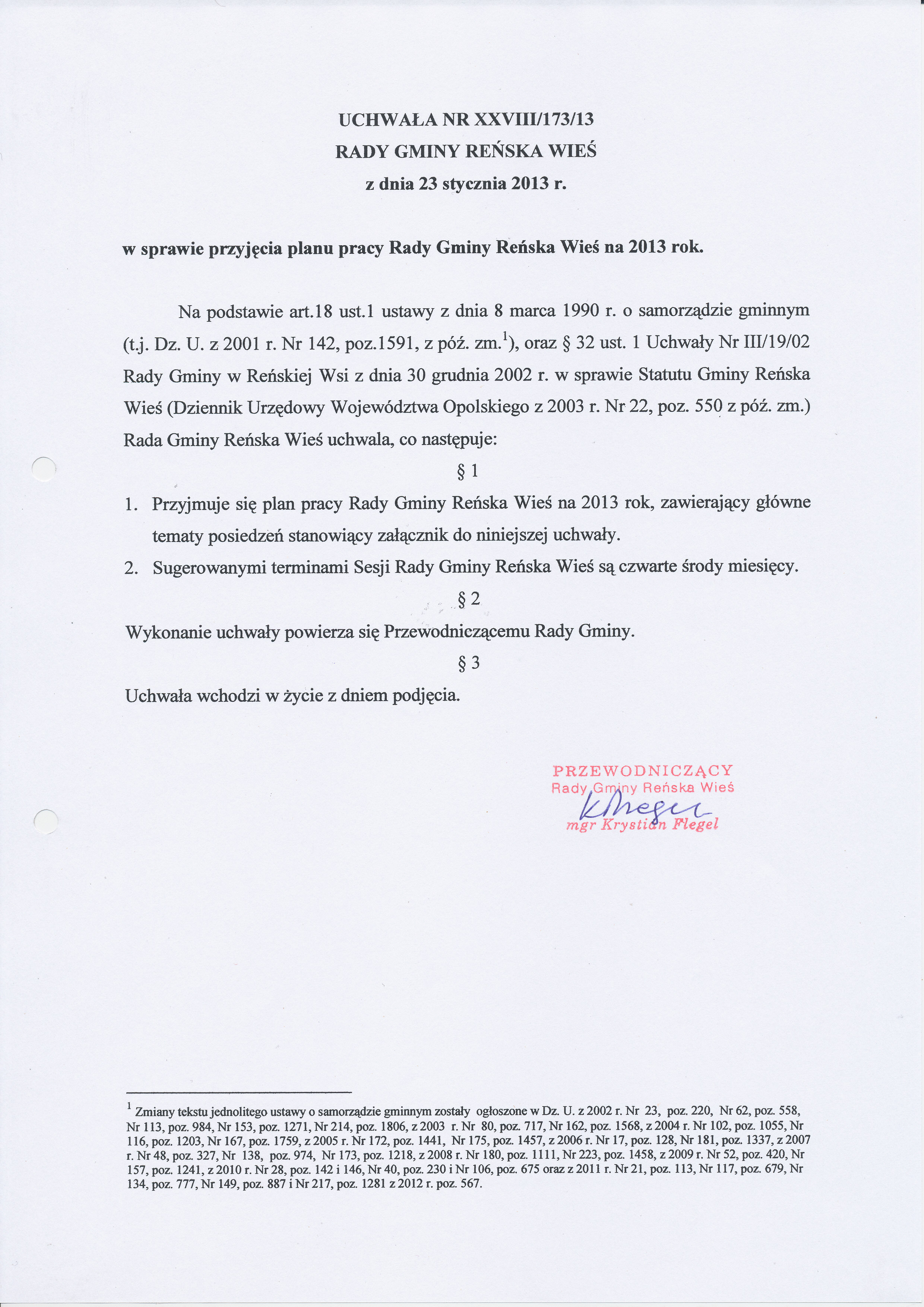 XXVIII/173/13 z dnia 23 stycznia 2013 r w sprawie przyjęcia planu pracy Rady Gminy Reńska Wieś na 2013 rok